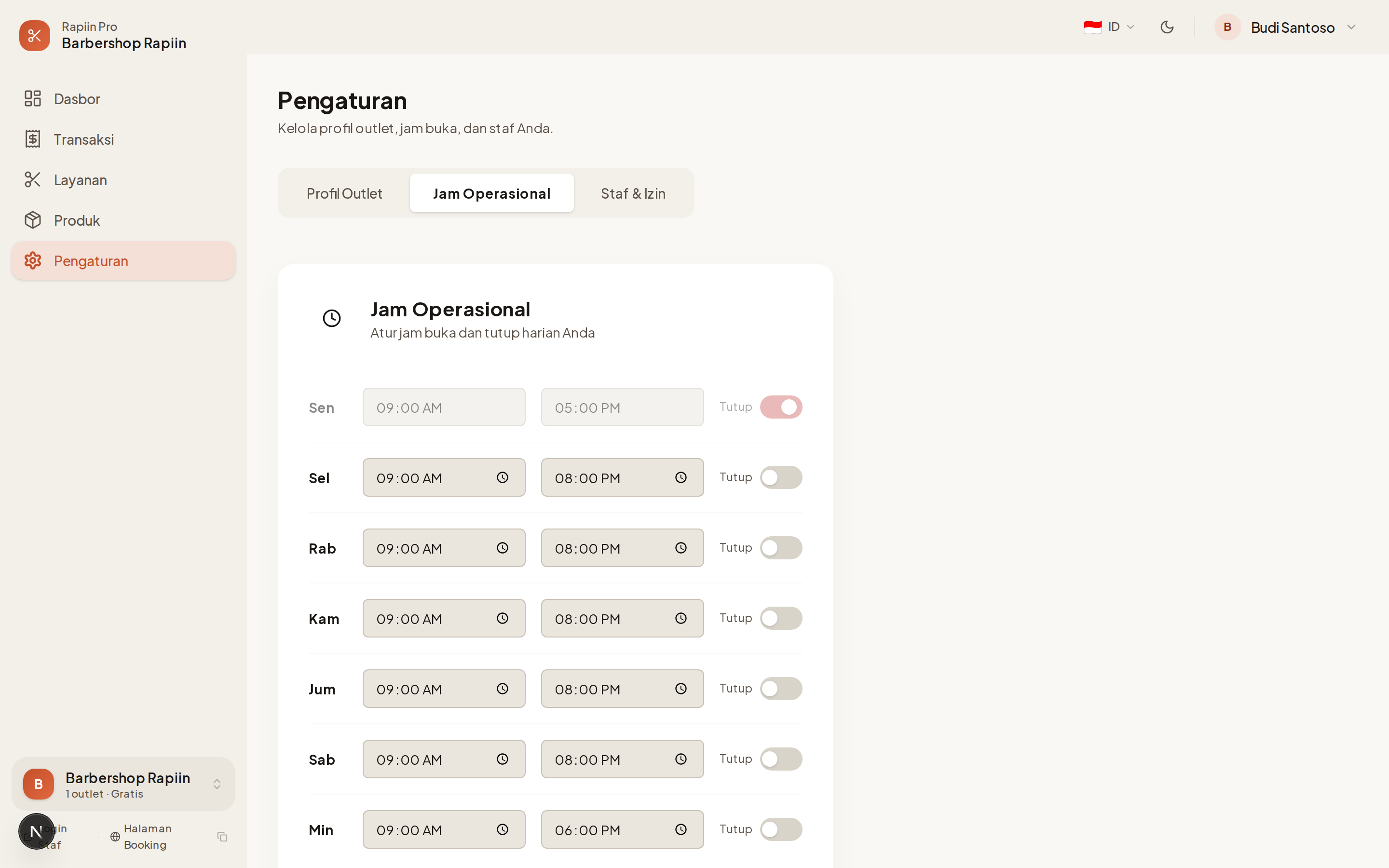 Tab Jam Operasional menentukan kapan outlet Anda bisa menerima booking. Slot waktu yang tersedia untuk pelanggan dihitung berdasarkan jam buka–tutup yang Anda atur di sini.