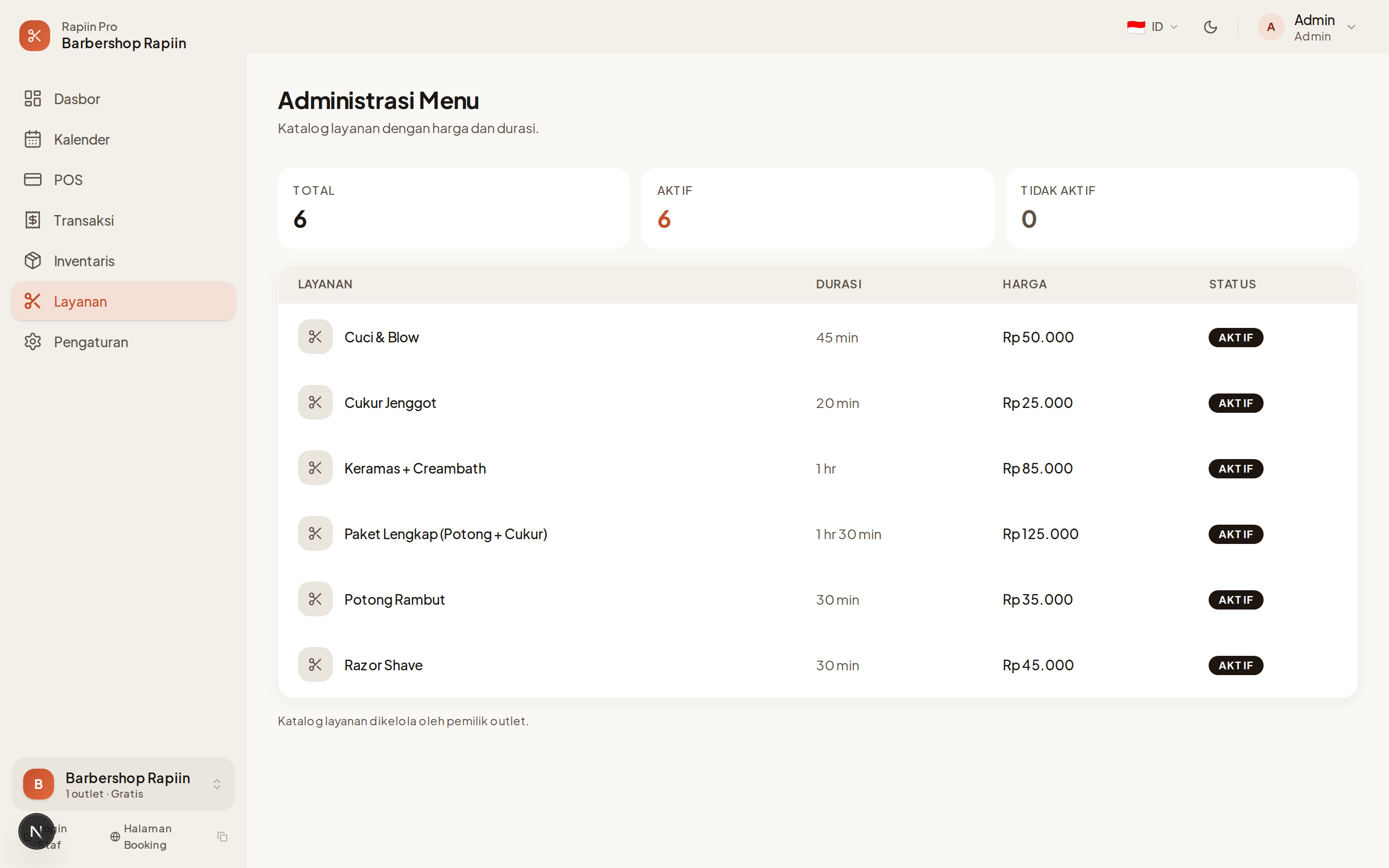 Untuk mengubah atau menambah layanan, hubungi pemilik outlet. Pengelolaan layanan hanya bisa dilakukan dari dashboard pemilik.